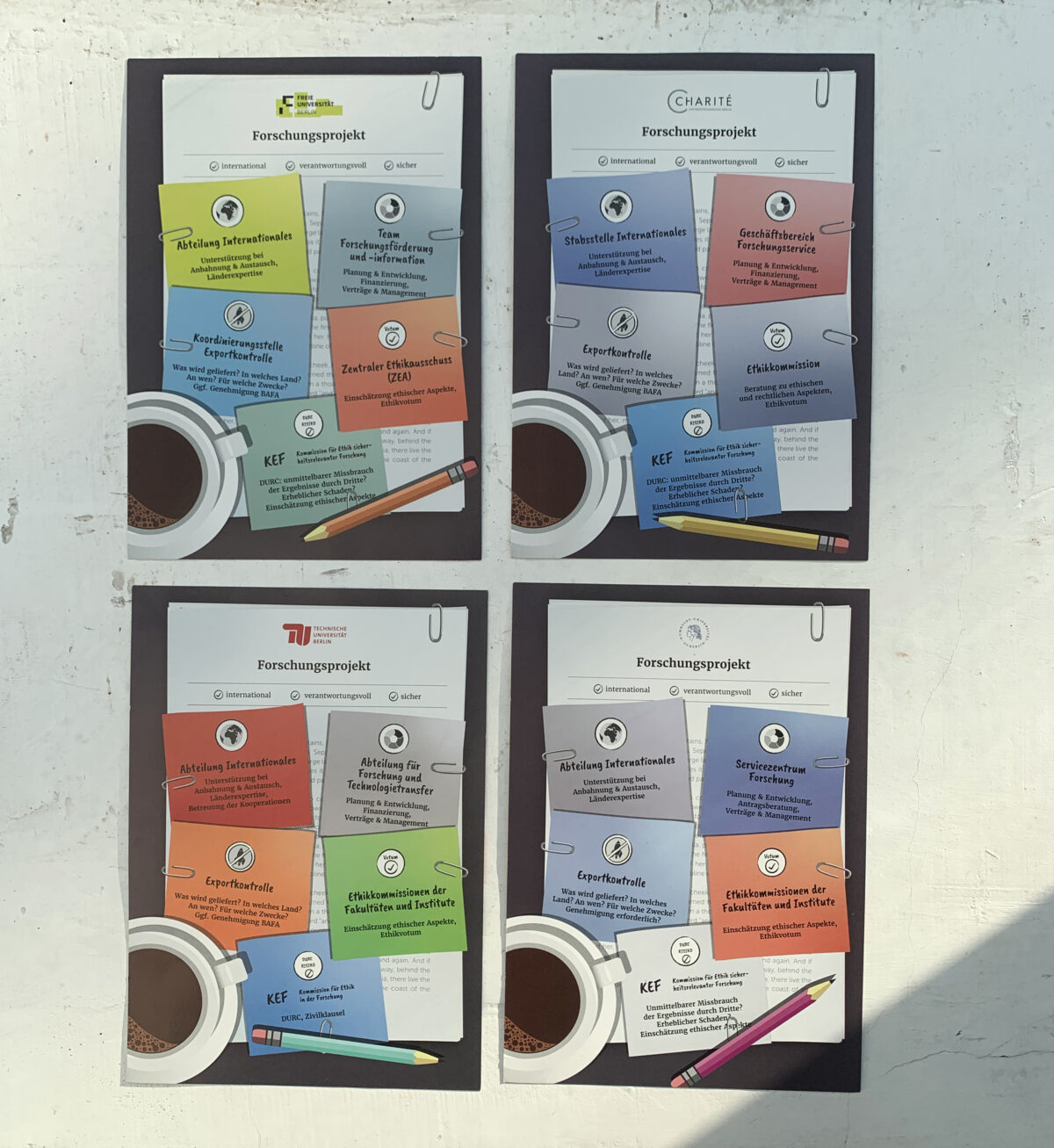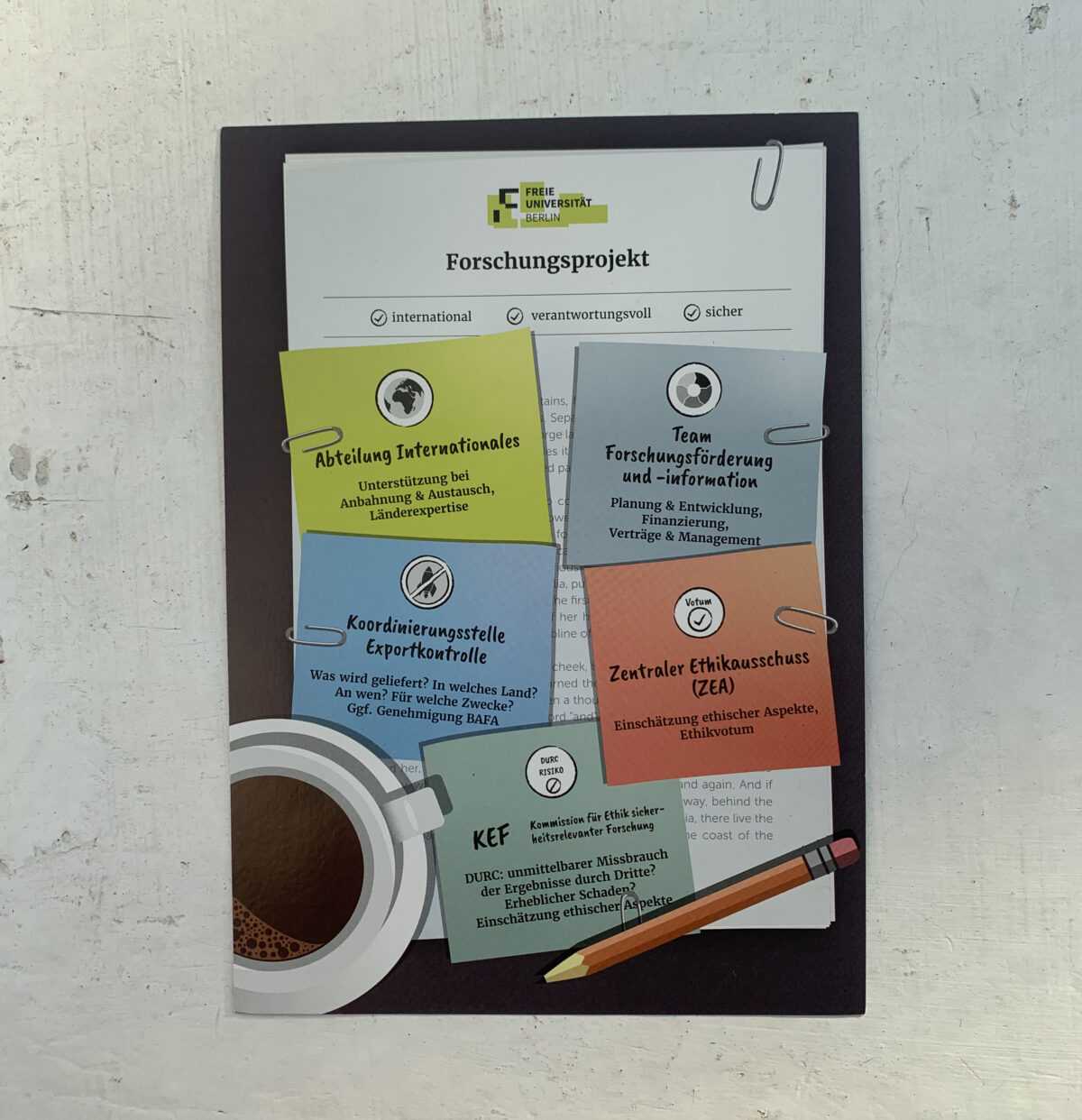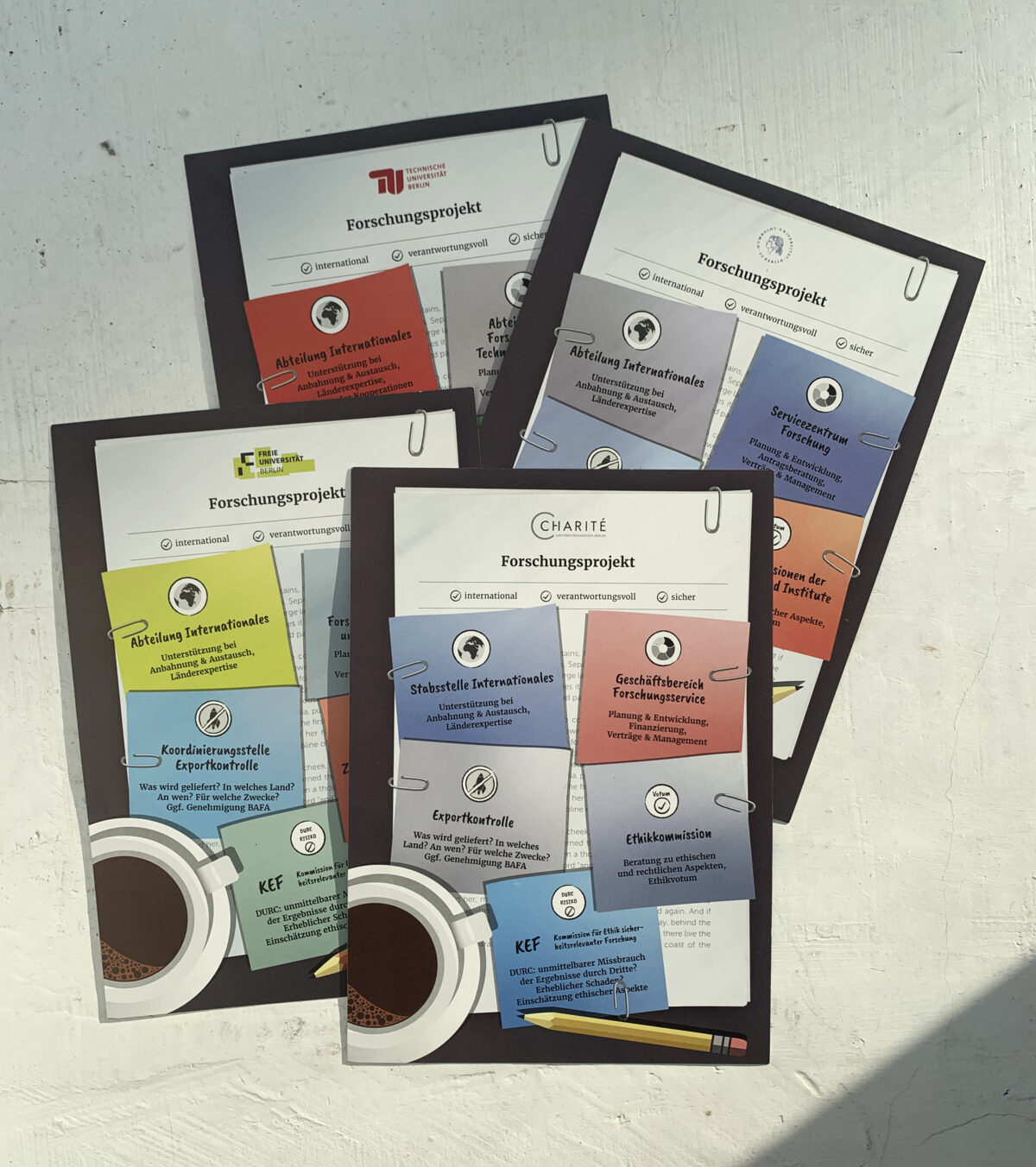 The graphic plays with one of the last steps before the publication of a research paper, in which it should still make its way through the contact points. A separate version was created for each of the four institutions (Freie Universität Berlin, Humboldt-Universität zu Berlin, Technische Universität Berlin, Charité – Universitätsmedizin Berlin), as the contact points differ in some respects.