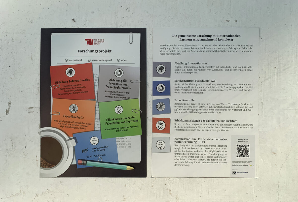 On the topic of diplomatic resilience, the Berlin University Alliance (BUA) commissioned grafikbuero to produce an infographic and subsequently design a flyer illustrating the responsibilities of the various contact points in the field of responsible internationalisation.