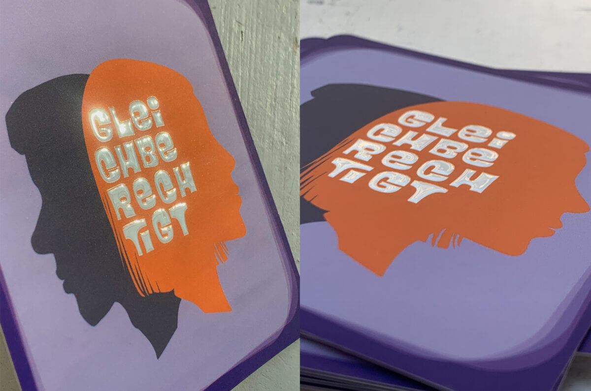 The simple emblem of overlapping female and male heads in profile is complemented by the comic-style display font chosen for the design. The font was coated with a 3D varnish during the printing process, making it stand out both haptically and visually from the rest of the card, which is coated with soft-touch foil.