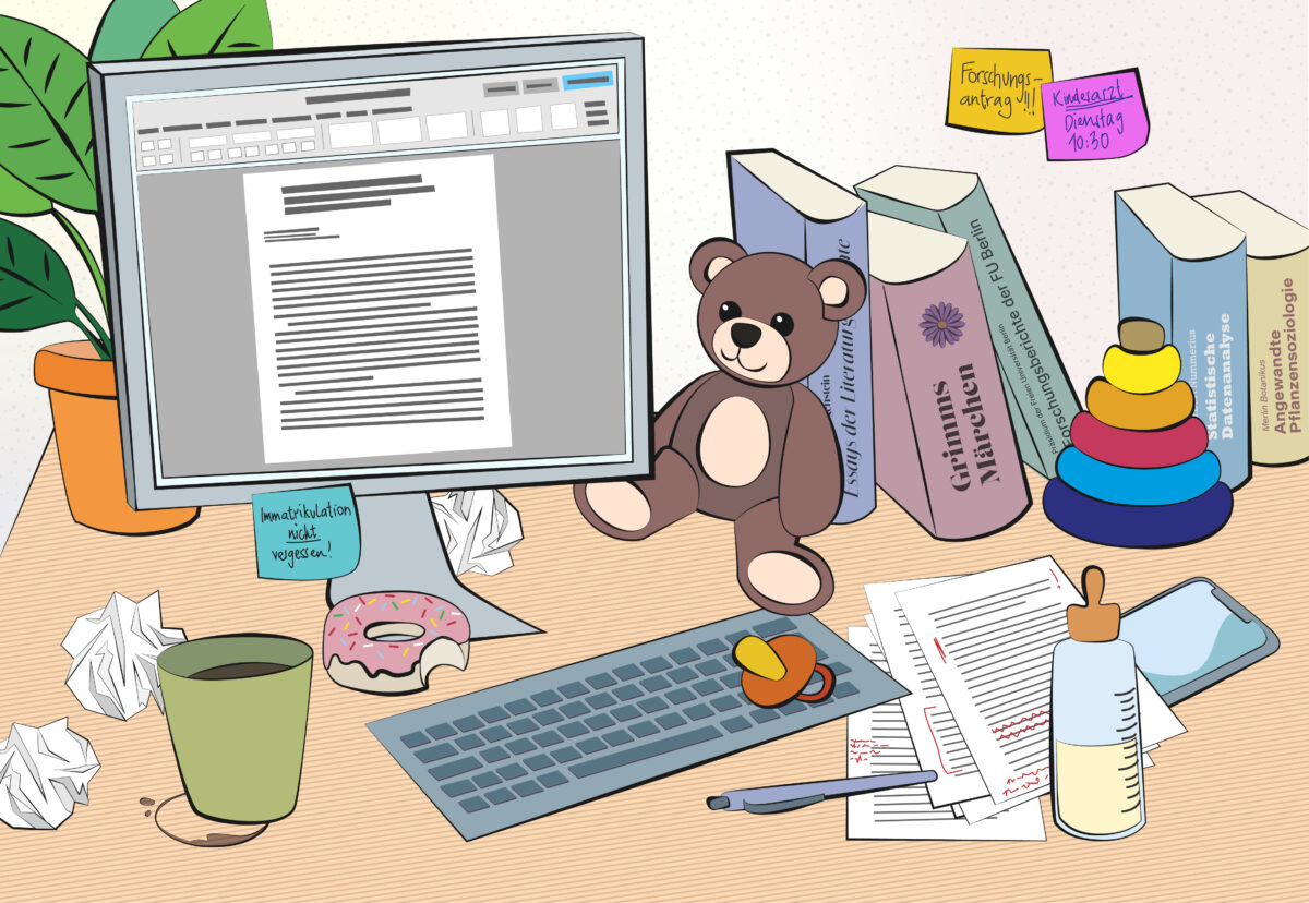 Im zweiten Teil dieses Auftrags entstand eine freie Illustration zum Thema „Vereinbarkeit von Familie und Studium/Beruf“, die eine alltägliche Situation dieses Themenfeldes geschlechterneutral darstellt.